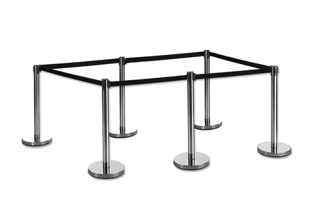 Set mit 6 FlexiBarrier Absperrpfosten -Eco- in Silber. Jeder Absperrpfosten enthält ein eingebautes, 2 Meter langes, einziehbares schwarzes Band.