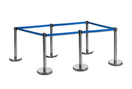 Set mit 6 FlexiBarrier Absperrpfosten -Eco- in Silber. Jeder Absperrpfosten enthält ein eingebautes, 2 Meter langes, einziehbares blaues Band.