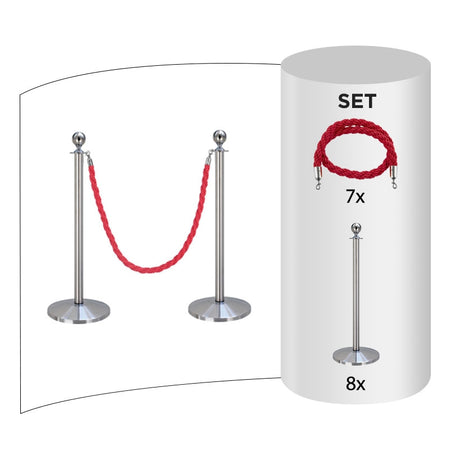 8 pack - Silver Flexibarrier Rope Barrier + Red rope (8x Silver Barriers + 7x Red Ropes)