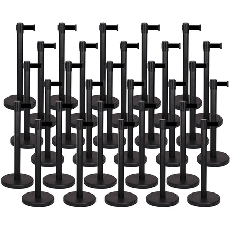 Soluzione completa da 30 pezzi di paletti segnapercorso con cintura FlexiBarrier -Eco- con pali neri e cinture nere retrattili integrate di 2 metri. Progettati per la gestione professionale delle file e il controllo della folla.